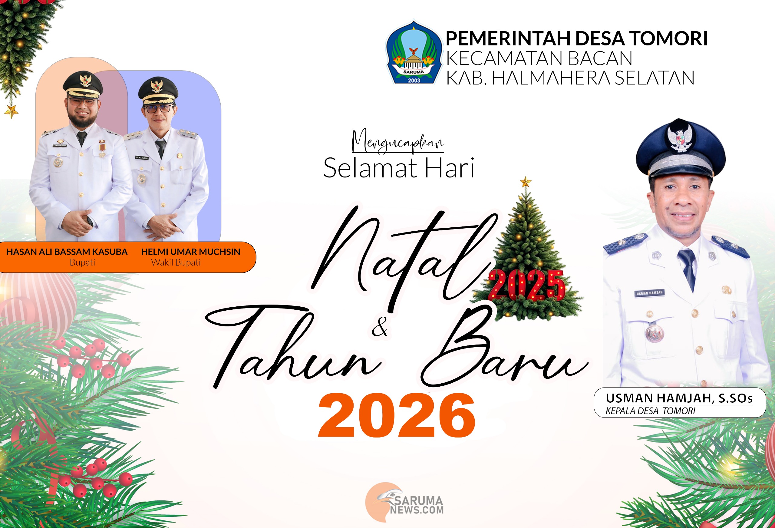 HAL-SEL:SARUMANEWS.COM — Pemerintah Desa Tomori, Kecamatan Bacan, Kabupaten Halmahera Selatan, menyampaikan ucapan Selamat Hari Raya Natal 2025 dan Tahun Baru 2026 kepada seluruh masyarakat, khususnya umat Kristiani yang merayakan.