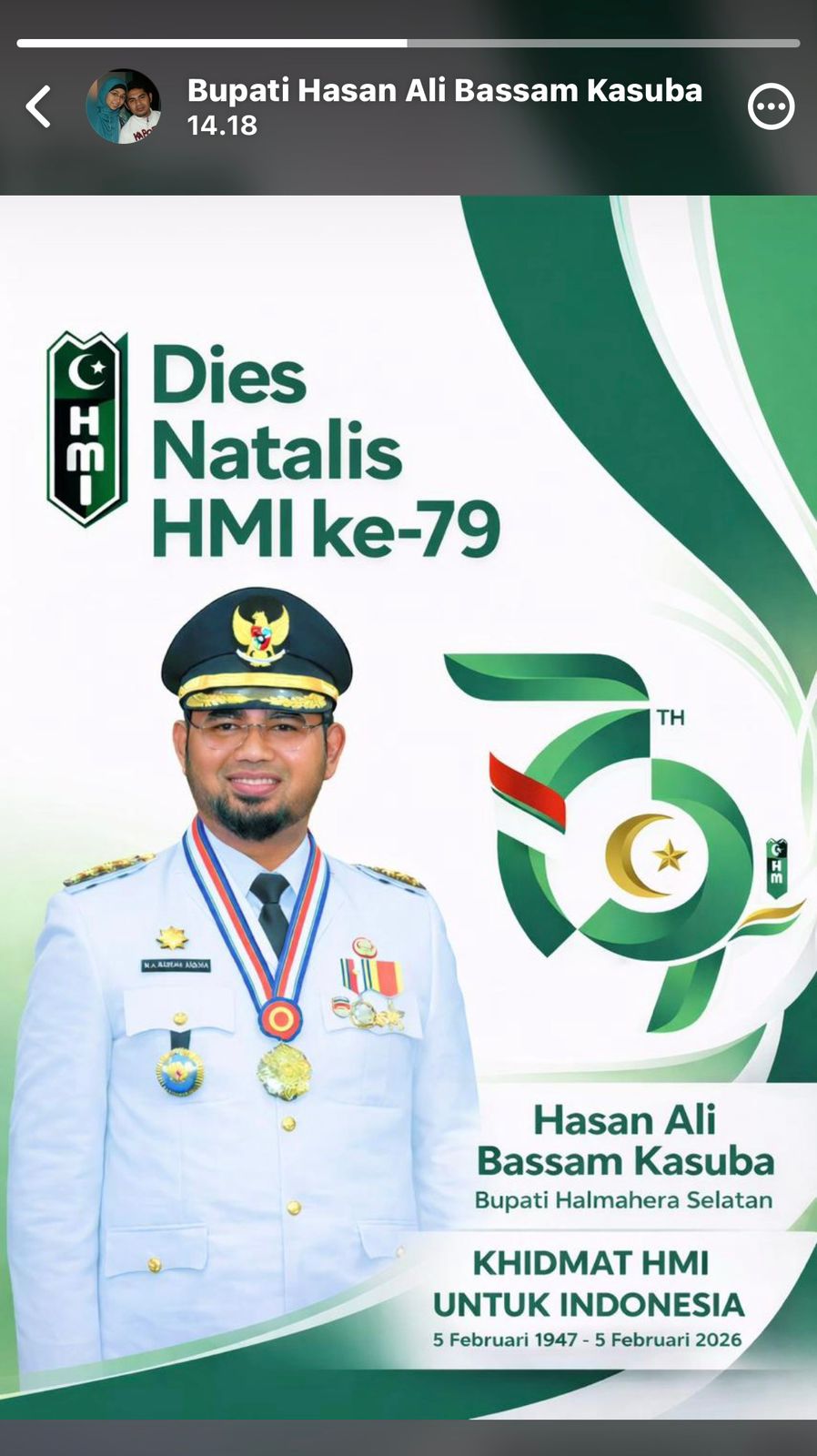 HAL-SEL:SARUMANEWS.COM – Bupati Halmahera Selatan, Hasan Ali Bassam Kasuba, menyampaikan ucapan selamat atas peringatan Dies Natalis Himpunan Mahasiswa Islam (HMI) ke-79 melalui flyer ucapan yang dibagikan pada status WhatsApp pribadinya, Rabu (5/2/2026).