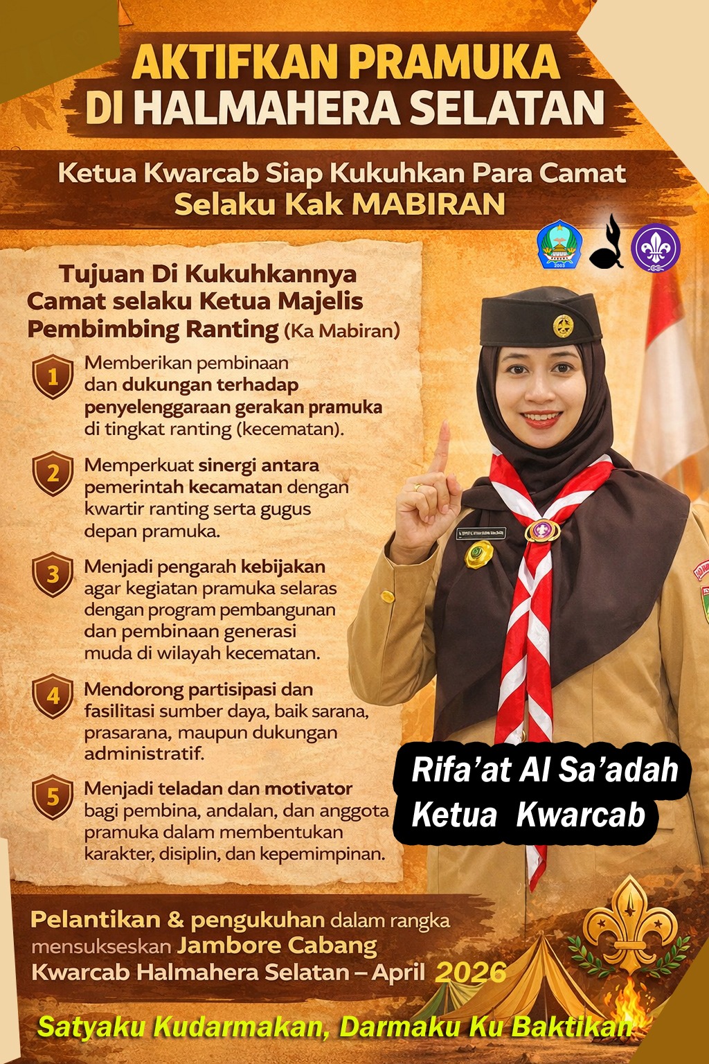 Pengukuhan ini sekaligus menjadi momentum konsolidasi organisasi dalam rangka menyukseskan Jambore Cabang Kwarcab Halmahera Selatan Tahun 2026, yang diharapkan menjadi ruang pertemuan, pembinaan, serta penguatan persaudaraan bagi anggota Pramuka dari seluruh kecamatan.