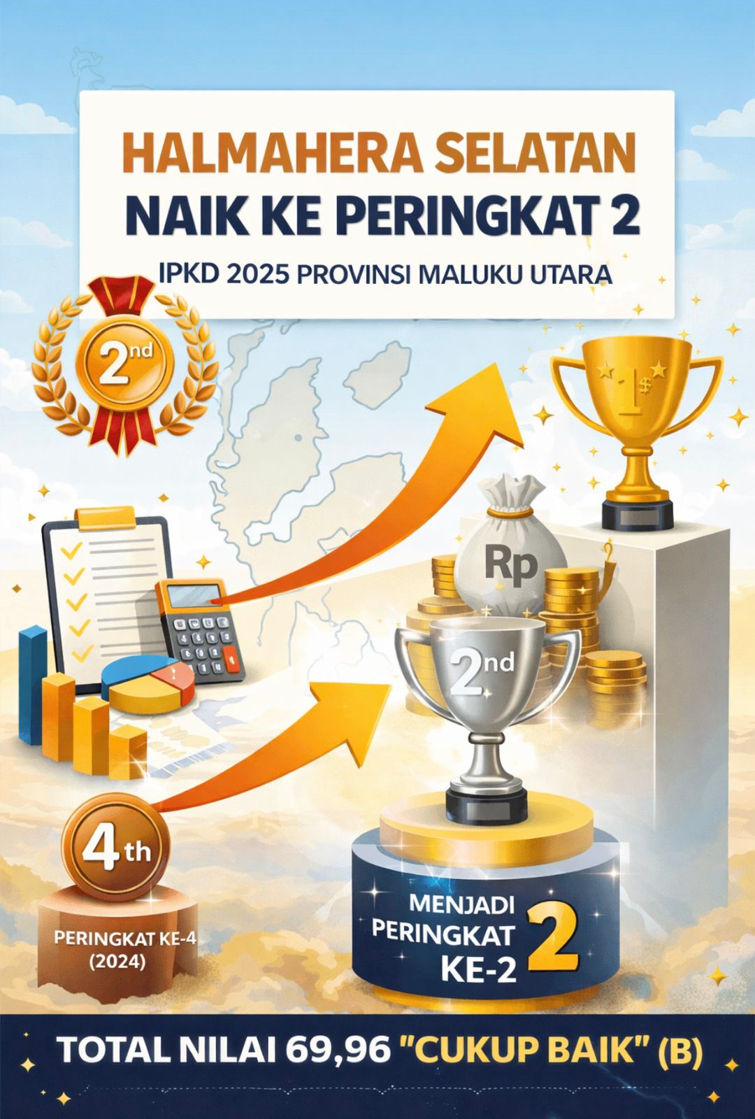MALUKU UTARA, SARUMANEWS.COM – Pemerintah Kabupaten Halmahera Selatan kembali menorehkan capaian membanggakan dalam tata kelola keuangan daerah. Berdasarkan Keputusan Gubernur Maluku Utara Nomor 528/KPTS/MU/2025 tentang Hasil Pengukuran Indeks Pengelolaan Keuangan Daerah (IPKD) Kabupaten/Kota se-Provinsi Maluku Utara Tahun Anggaran 2024, Tahun Ukur 2025, Halmahera Selatan berhasil naik ke peringkat kedua se-Maluku Utara.
